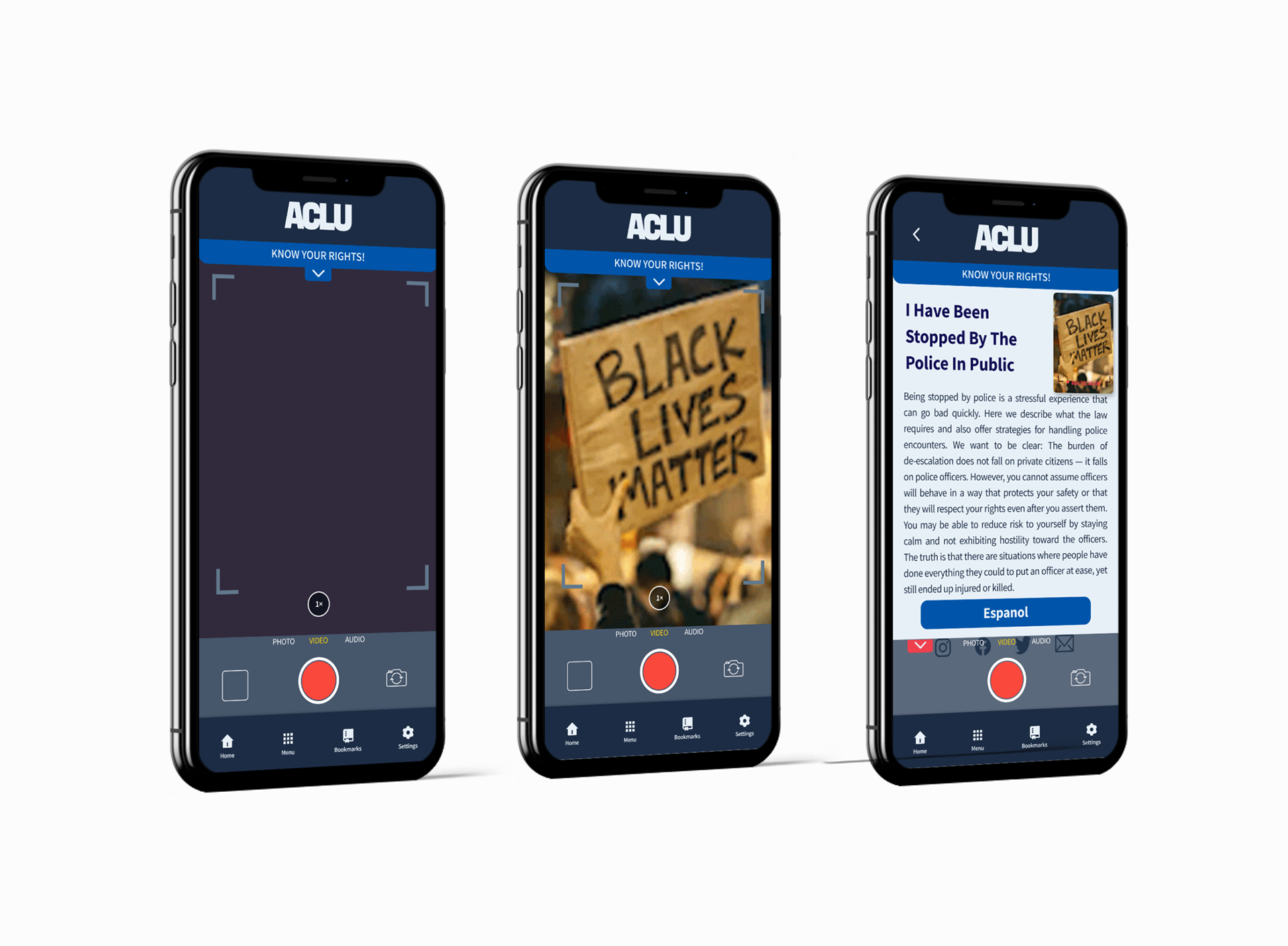 As a team of three we had the opportunity to work on redesigning the ACLU Mobile Justice App. Our goal was to give users easy access to clear information regarding their civil rights in the case of an emergency, as well as the ability to record and share any incident of rights violations.