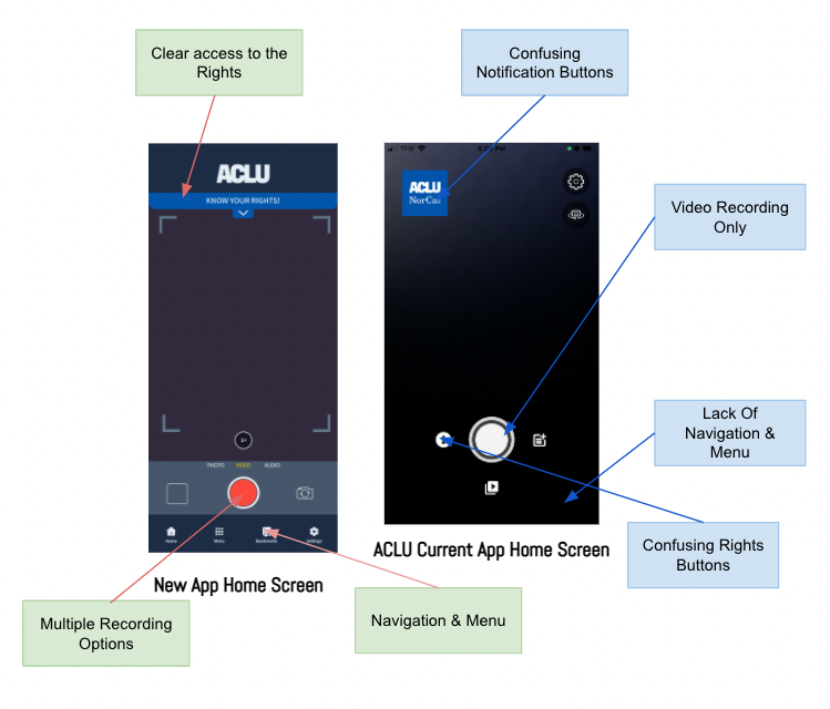 We defined our goals and challenges by conducting deep research on the ACLU and their current App. We asked the questions: who are they, what do they do, and why are they offering this service. Additionally, we reviewed the website and the app.